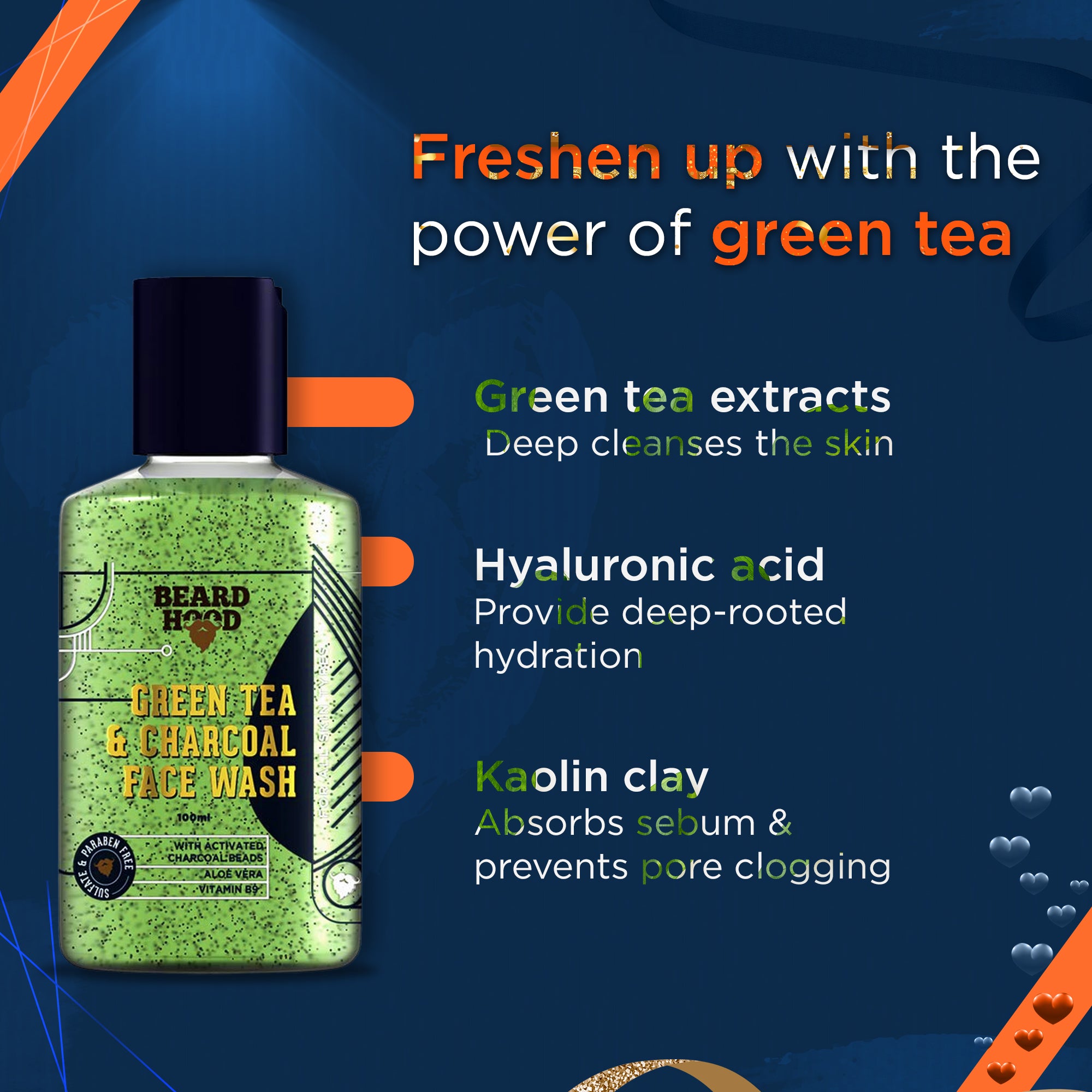 Green tea facewash- Purified Aqua, Green Tea Extract, Sodium Lauroyl Methyl Isethionate (and) Cocamidopropyl Betaine (and) Sodium Methyl Oleoyl Taurate (and) Lauryl Glucoside (and) Coco Glucoside, Acrylates Copolymer, Refined Glycerin, Capryloyl/ Caproyl Methyl Glucamide (and) Lauroyl/ Myristoyl Methyl Glucamide, Aloe Vera Extract, ACB Fruit Mix, Butylene Glycol (and) Bacillus/ Folic Acid, Ferment Filtrate Extract (and) Sodium, Hyaluronate, Polysorbate 20, Ten Tree Extract, Sodium Hydroxide, Vitamin E, IFRA Certified Fragrance, Spinach Extract, Phenoxy Ethanol, Sodium Benzoate, Activated Charcoal Beads, Sodium Gluconate
