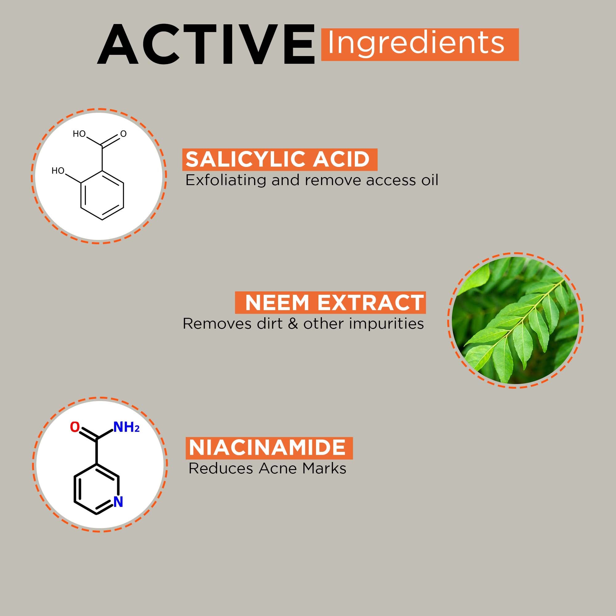 Purified Aqua, Decyl Glucoside, Sodium Lauroyl Sarcosinate, Cocamidopropyl Betaine, Acrylates Copolymer, Refined Glycerin, Propylene Glycol, Aloe Vera Extract, Neem Extract, Salicylic Acid, Lemon Extract, Orange Peel Extract, Sodium PCA, Panthenol, Niacinamide, Ethylhexyl Glycerin, Phenoxy Ethanol, Lactic Acid, Sodium Gluconate