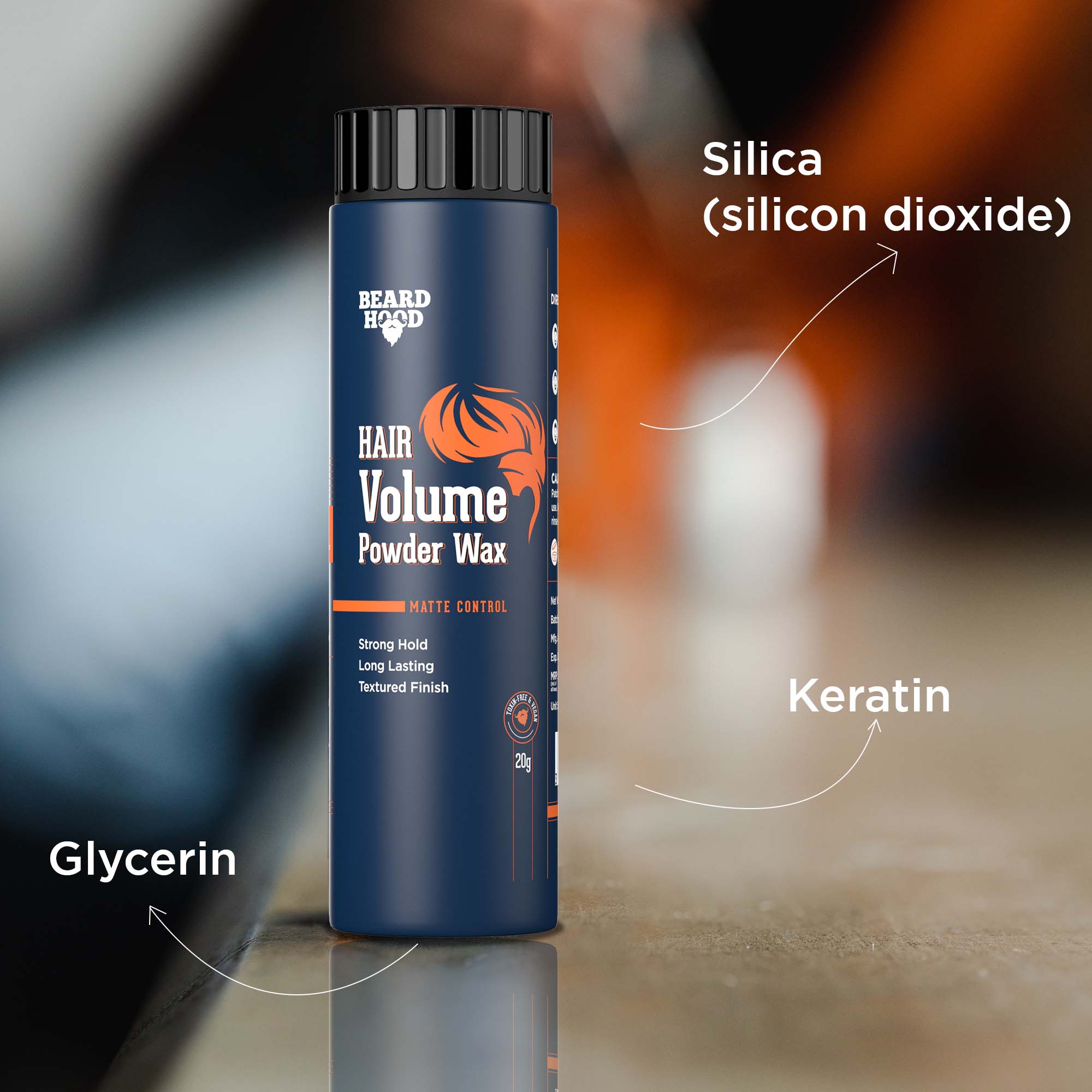 Hair volume powder wax - Hydrolised keratin, refined glycerin, silica, sodium benzoate, limestone, PVP, VP/VA copolymer, propyl alcohol, IFRA certified fragrance.