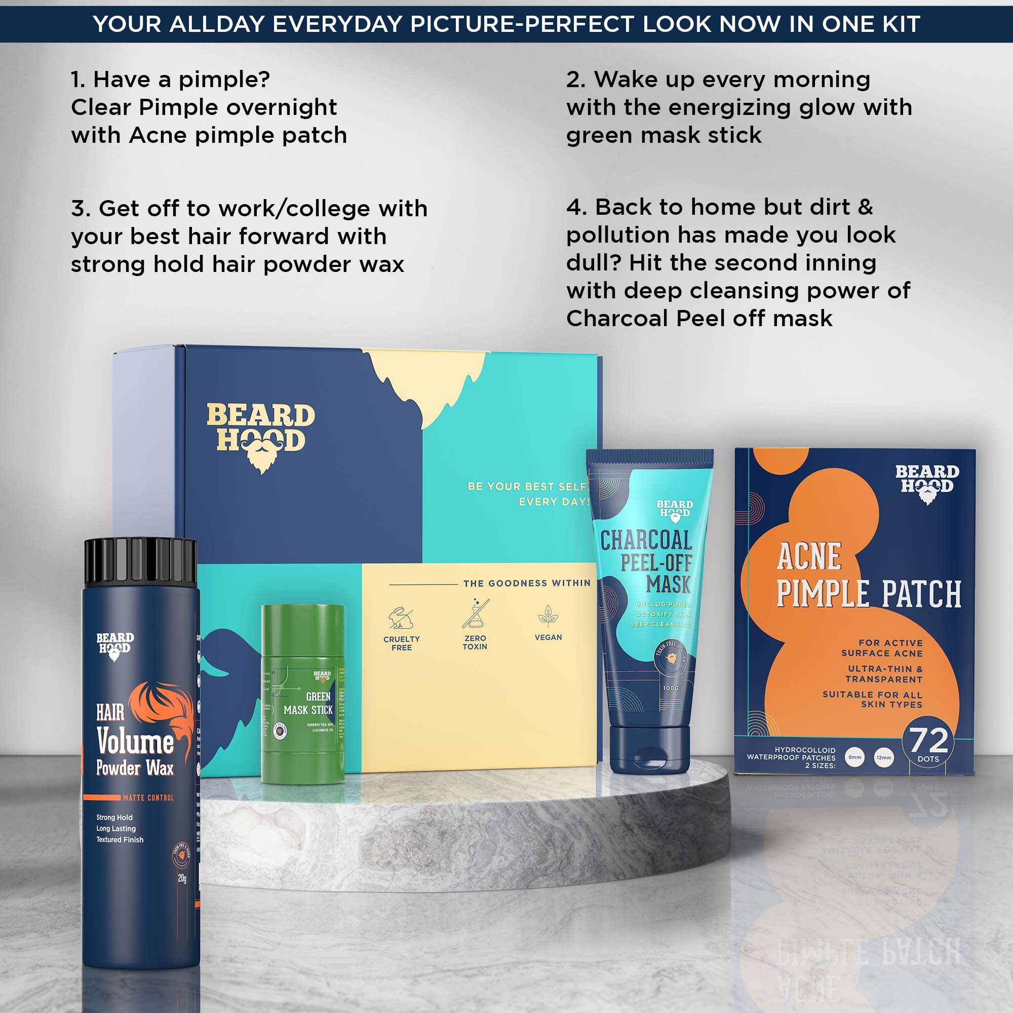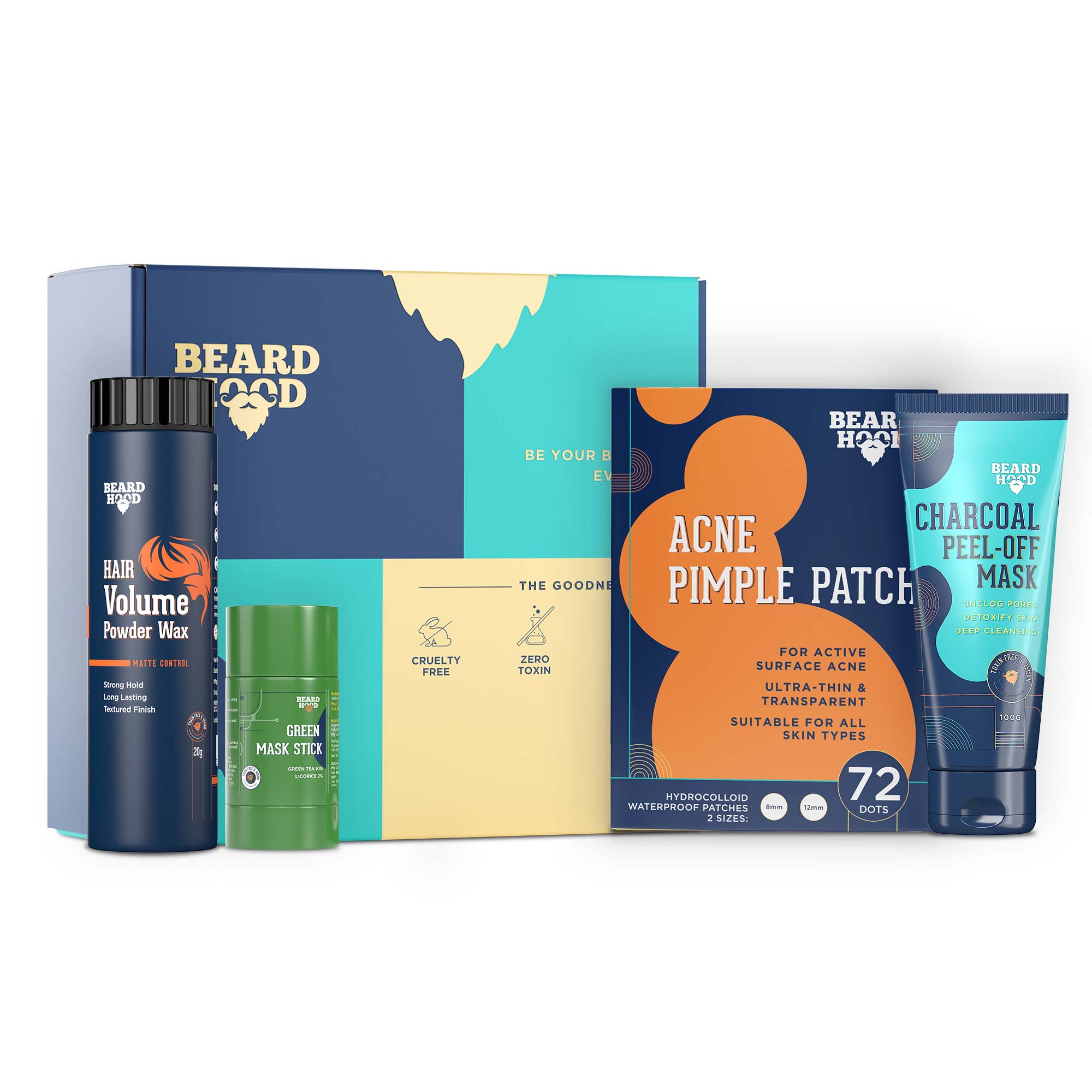 - Product Name: Fabfour kit (Green Mask Stick, Peel Off Mask, Acne Pimple Patch, Hair Volume Powder Wax), Gift Box