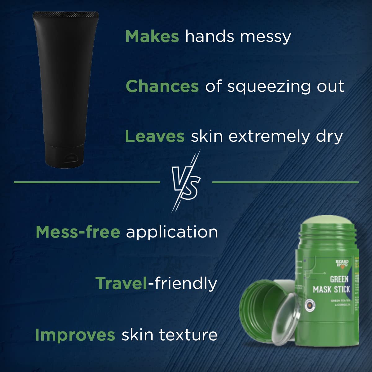 Beardhood's Green Mask Stick is power-packed with so many benefits to give you the skin you deserve. It targets congested pores, oily skin, acne, blemishes, dark spots, and inflammation. It’s a perfect skin detoxifier and is super easy to use.